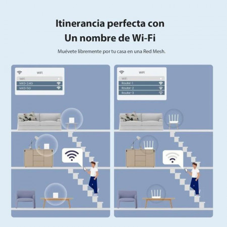 - Red Unificada: Crea una red doméstica completa con un solo nombre de Wi-Fi. El sistema selecciona automáticamente la mejor conexión a medida que te desplazas por la casa, manteniendo una experiencia de usuario consistente.