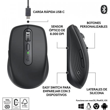 El MX Anywhere 3S incorpora un sensor óptico de 8.000 DPI que garantiza una capacidad de respuesta de última generación en diversas superficies, incluso sobre cristal. Esto se traduce en un movimiento del cursor preciso y fluido, sin importar dónde te encuentres.
