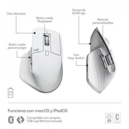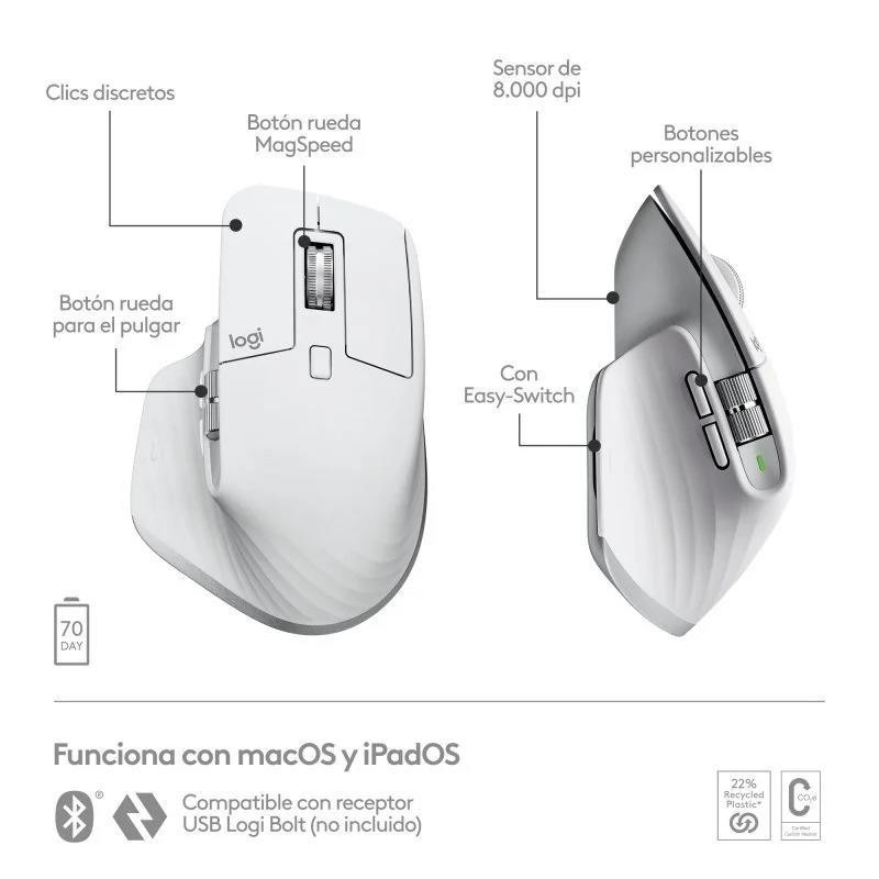 El MX Master 3S para Mac está diseñado para ofrecer la máxima productividad y comodidad en tu entorno Apple. Experimenta la diferencia con este ratón de alto rendimiento.