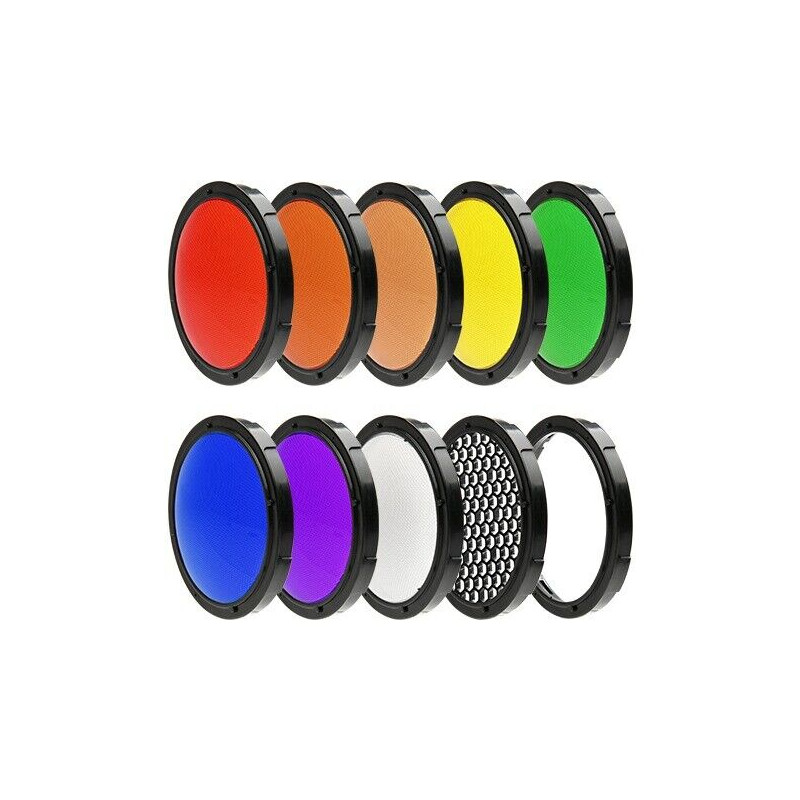 El kit de láminas de colores compuesto por los colores rojo, naranja, arena, amarillo, verde, azul y violeta. Adicionalmente incluye rejilla, difusor y marco de gel.