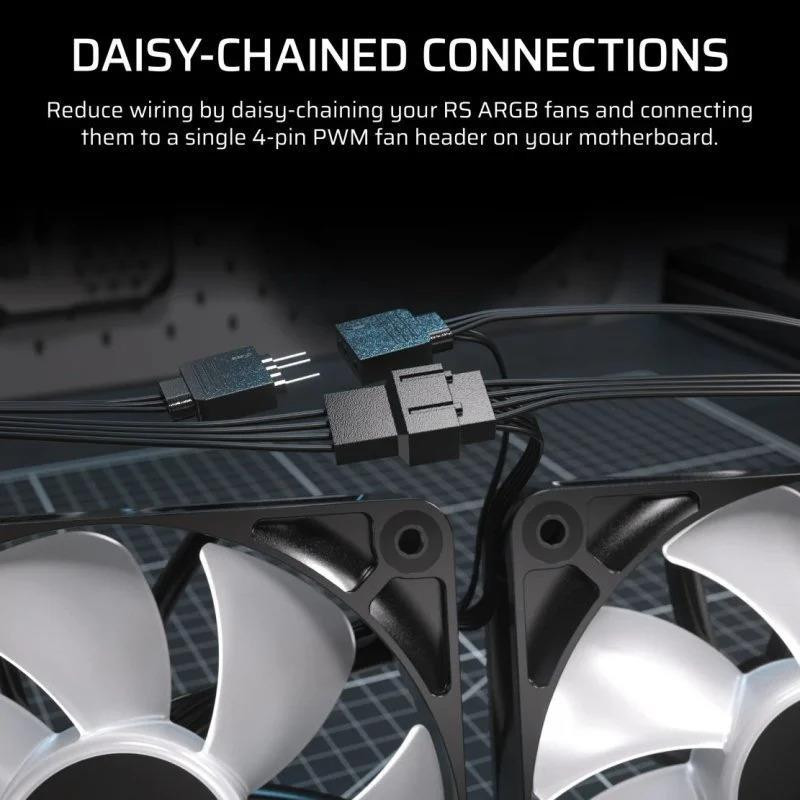 Conexiones en Cadena: Simplifica el cableado conectando los ventiladores RS en cadena a un único conector de ventilador PWM de 4 pines en la placa base.
