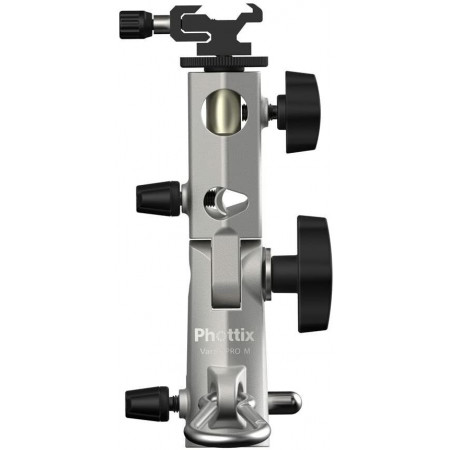 El soporte para paraguas con zapata de flash multifunción Varos Pro M de Phottix es un 300% más resistente que las versiones anteriores y cuenta con un cuerpo de aleación de aluminio con una zapata fría de metal, así como un inserto roscado hembra de 3/8" y 1/4" y un macho. inserte con tornillos de 3/8" y 1/4". El soporte para paraguas en forma de lágrima del soporte acepta ejes de 7 a 10 mm de diámetro y está inclinado 8 grados para permitir que llegue más luz al centro del paraguas. Su mecanismo de inclinación patentado de 180 grados soportará hasta 28 kg (62 lb). El Varos Pro M tiene un orificio para colgar con un clip para usar con un contrapeso u otro accesorio.