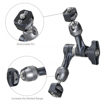 Brazo mágico SmallRig con engranaje de roseta (7") 4194 , fabricado en aluminio de calidad aeronáutica y acero inoxidable, cuenta con tornillos de 1/4"-20 y pasadores extensibles en ambos extremos para sujetar de forma segura dichos accesorios, particularmente con orificios anti-torsión, como monitores, luces de video LED, micrófonos, teléfonos móviles, iPads, cámaras de acción. El tornillo de mariposa ayuda a bloquear los accesorios y tiene orificios para una llave hexagonal para un mayor ajuste; y los cabezales de bola, que son ajustables 360 grados, vienen con un patrón en espiral para aumentar la fricción y soportar hasta 3 kg de carga. En la unión de roseta de acero inoxidable, hay un resorte para un ajuste de ángulo más fácil. Una palanca de pulgar anti-desplazamiento diseñada ergonómicamente, con un cojinete de bolas de empuje incorporado, se siente suave y cómoda y bloquea rápidamente el brazo y los cabezales de bola en un segundo. Este brazo de roseta está mecanizado por CNC para una mayor robustez y durabilidad y también está equipado con almohadillas en ambos soportes de accesorios para evitar rayones.
