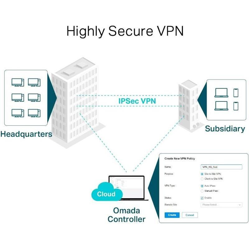 - VPN altamente segura, soportando hasta 100 conexiones IPsec LAN a LAN, 50 OpenVPN, 50 L2TP y 50 PPTP.