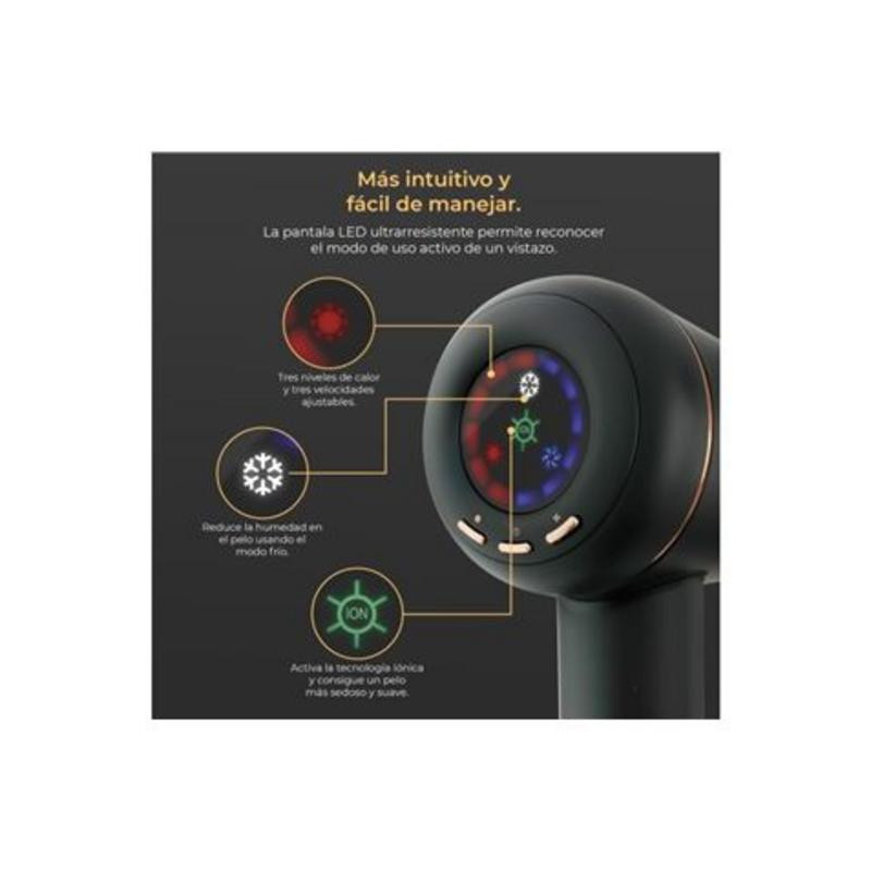 La tecnología iónica integrada libera iones negativos que neutralizan la electricidad estática, eliminando el encrespamiento y dejando el cabello suave, brillante y con un aspecto saludable. El display LED te permite controlar fácilmente los 3 niveles de velocidad y los 4 niveles de temperatura, adaptándose a todo tipo de cabello y estilos. Además, la función de aire frío sella la cutícula capilar, fijando el peinado y aportando un brillo extra.