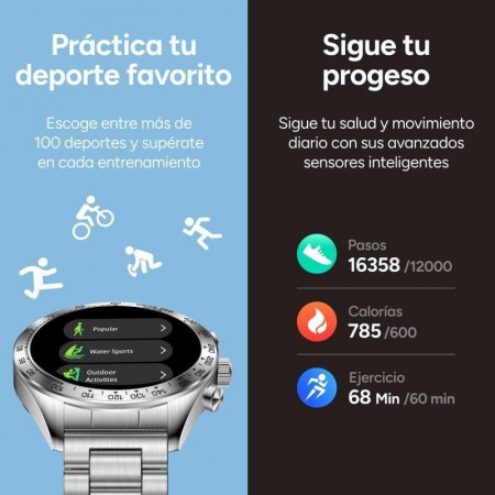 - Más de 100 Modos Deportivos: Registra cada actividad con precisión, desde correr hasta yoga, con métricas detalladas de pasos, distancia y calorías quemadas.