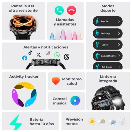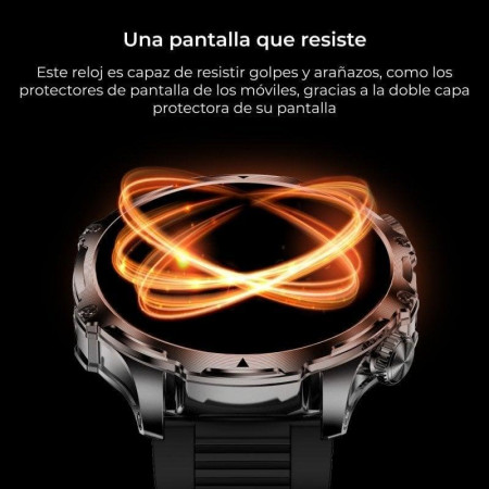El Ksix Venture es un smartwatch robusto diseñado para usuarios avanzados y deportistas que buscan una monitorización integral y conectividad práctica. Su pantalla XXL TFT de 1,85", protegida por doble capa antiarañazos, facilita la visualización incluso en exteriores. Con resistencia al agua IP68, puedes usarlo en diversas condiciones. Está pensado para actividades al aire libre, aunque se recomienda precaución con contactos prolongados con agua salada o cloro.