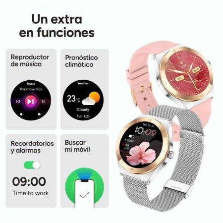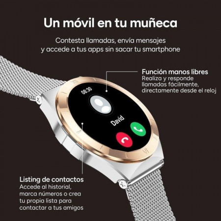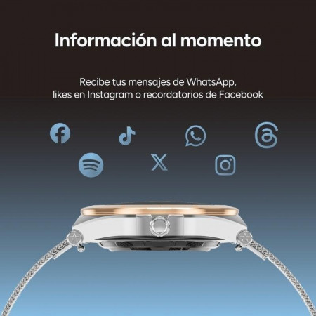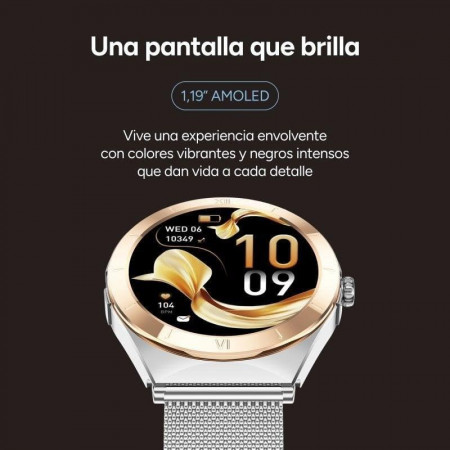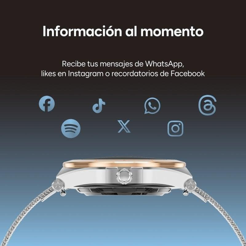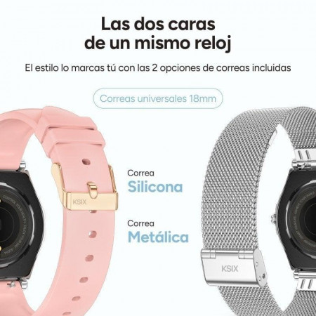 Este smartwatch destaca por su versatilidad, incluyendo dos correas intercambiables: una de silicona para entrenamientos y otra metálica para ocasiones más formales. Ambas de 18 mm y fáciles de cambiar sin necesidad de herramientas.