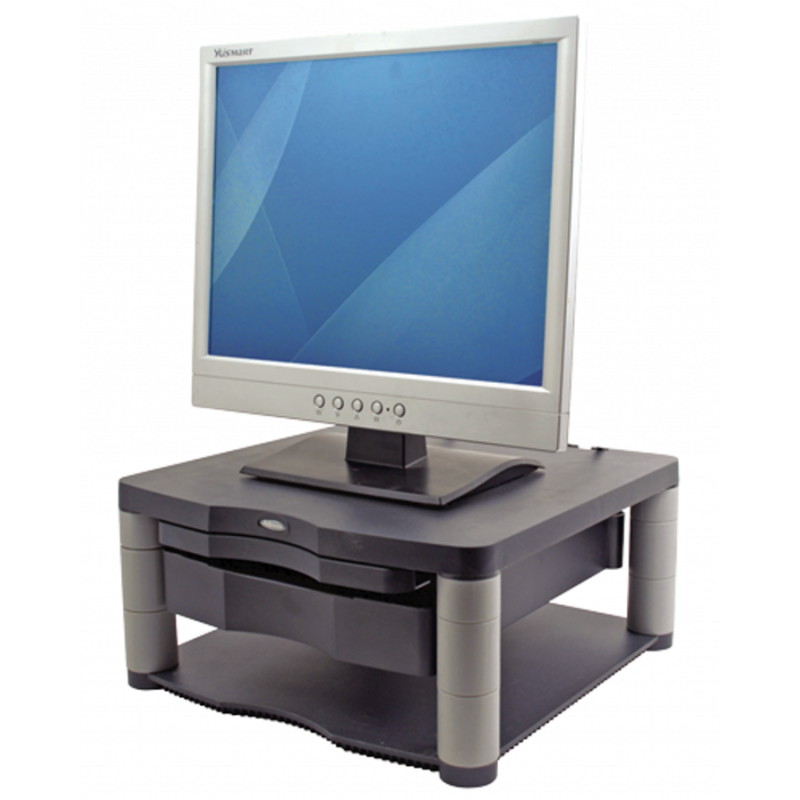 Optimiza tu espacio de trabajo con el soporte de mesa para monitor LCD Fellowes Premium Plus. Este soporte eleva tu monitor a una altura de visión cómoda, reduciendo la tensión en el cuello y los ojos, y promoviendo una postura ergonómica.