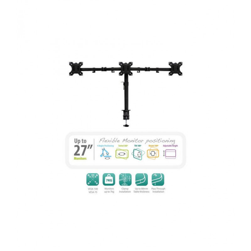 - Soporte de escritorio triple para monitores de hasta 27 pulgadas (7 kg por monitor)