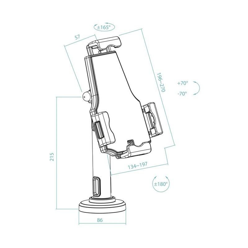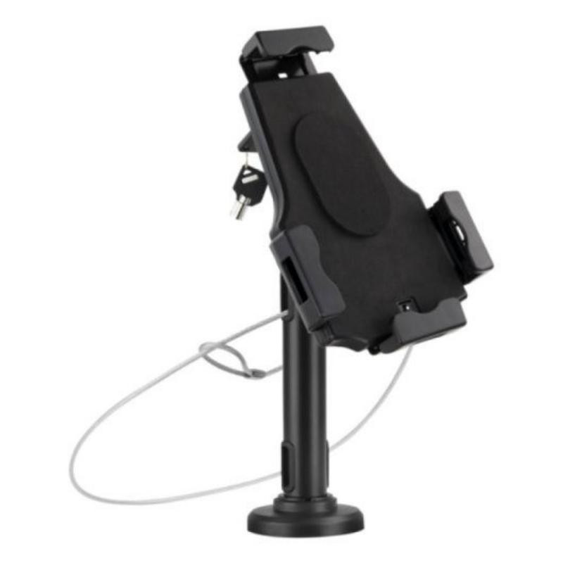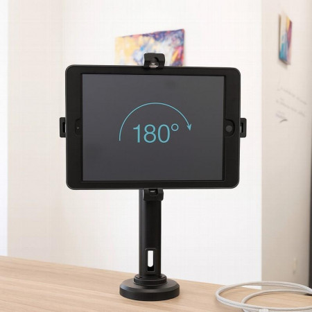 El soporte permite una rotación de 180°, ofreciendo mayor versatilidad y comodidad para el usuario. Su diseño robusto y funcional lo convierte en la opción perfecta para negocios, comercios y espacios públicos que buscan proteger sus tablets sin renunciar a la estética.