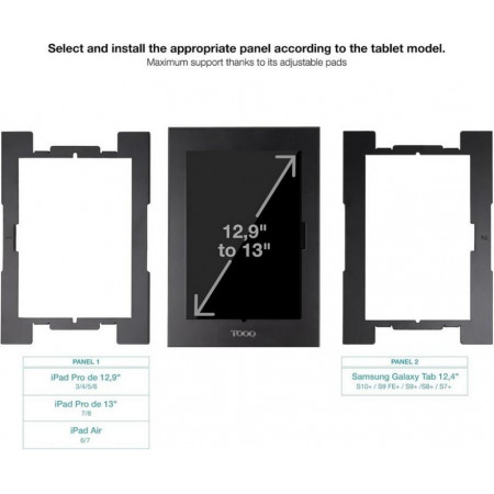 El marco antirrobo TOOQ TQATTE2601-M-B ofrece una solución de seguridad robusta y elegante para tablets de 12.4 a 13 pulgadas. Diseñado específicamente para entornos comerciales, puntos de información y uso profesional, este marco asegura que tu dispositivo esté protegido contra robos y manipulaciones, al mismo tiempo que permite su uso interactivo.