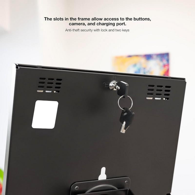 Fabricado en acero de alta calidad y con un acabado en color negro, garantiza durabilidad y una integración discreta en cualquier espacio. Su diseño universal lo hace compatible con una amplia gama de tablets de formato similar. El sistema de cerradura con llave proporciona una seguridad fiable, e incluye dos llaves para mayor comodidad.