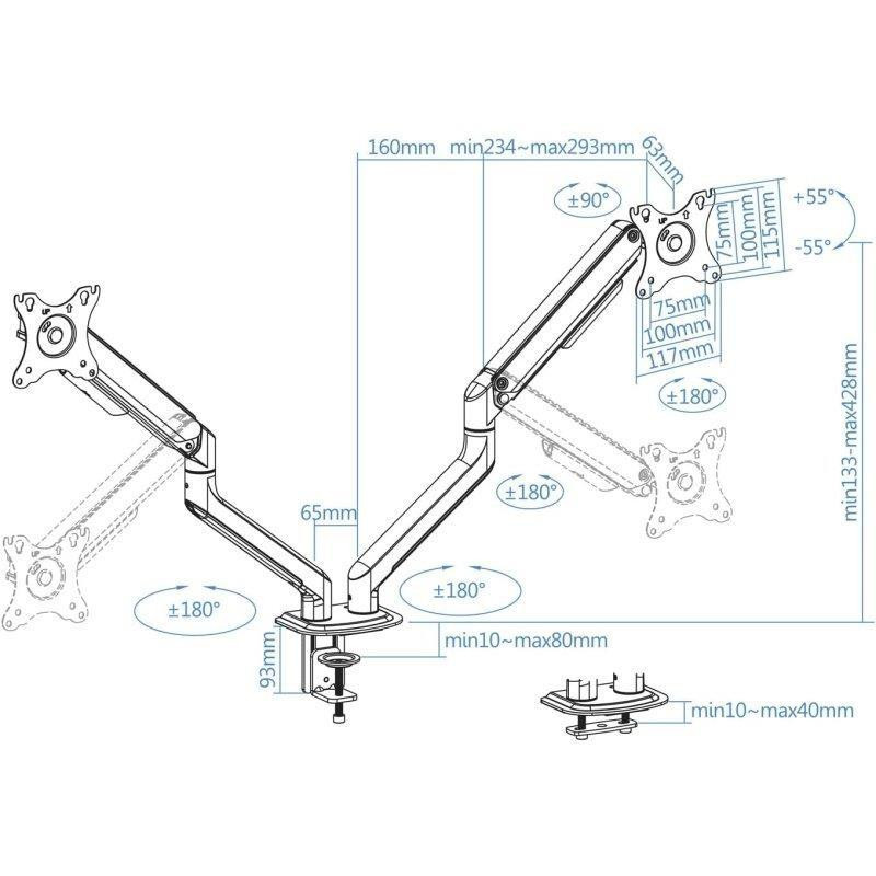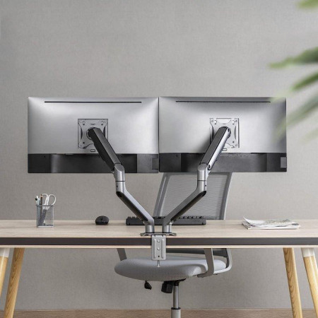 Con dos sistemas de montaje incluidos, podrás elegir la opción que mejor se adapte a tu escritorio, ambos garantizando una estabilidad sólida. Gira, inclina o rota tus pantallas para encontrar el ángulo perfecto y reducir la fatiga visual.