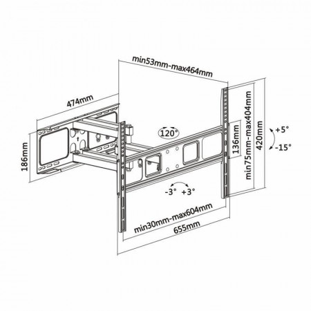 - Distancia ajustable: La distancia a la pared es ajustable entre 53 y 464 mm, permitiendo una mayor flexibilidad en la colocación del televisor.