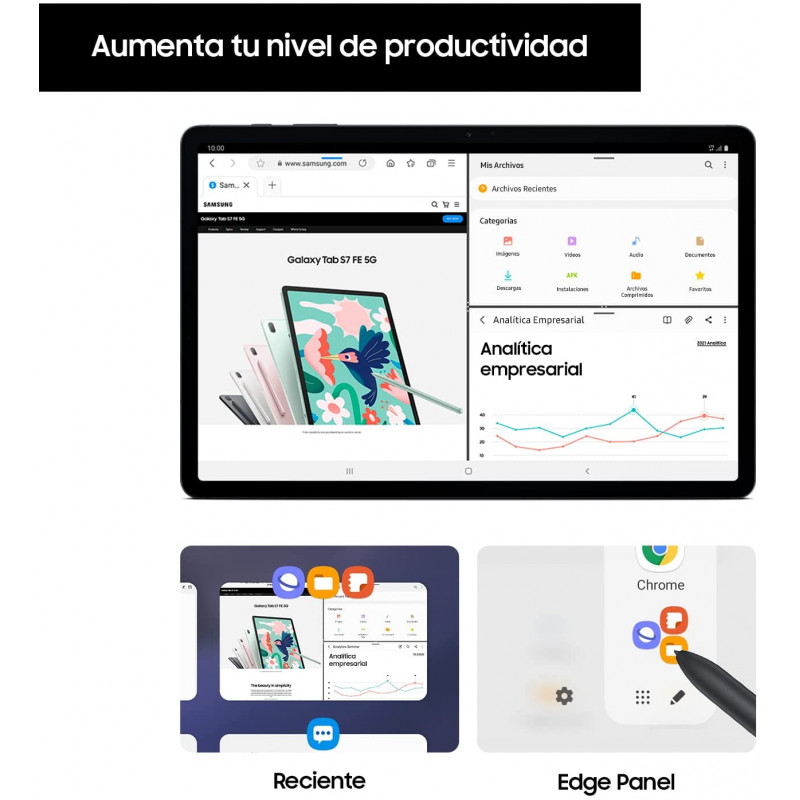 - Con un chipset de alto rendimiento Snapdragon 750G, esta tablet Android Samsung Galaxy Tab S7 FE hace que tus retransmisiones y tu juego sean fluidos y rápidos. Podrás realizar multitarea con facilidad con hasta tres aplicaciones a la vez.