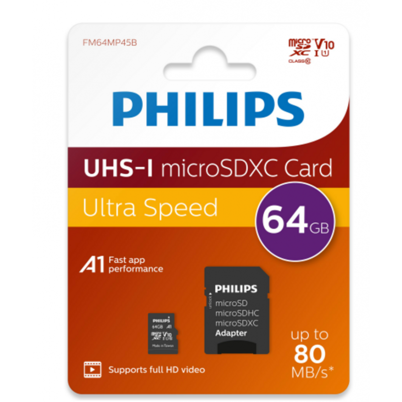 La tarjeta de memoria Philips Micro SD de 64GB (Clase 10 / UHS-I U1) es la solución perfecta para expandir la capacidad de almacenamiento de tus dispositivos electrónicos. Diseñada para un rendimiento fiable, te permite guardar miles de fotos, vídeos en alta definición, aplicaciones y documentos con total facilidad, sin preocuparte por la velocidad.