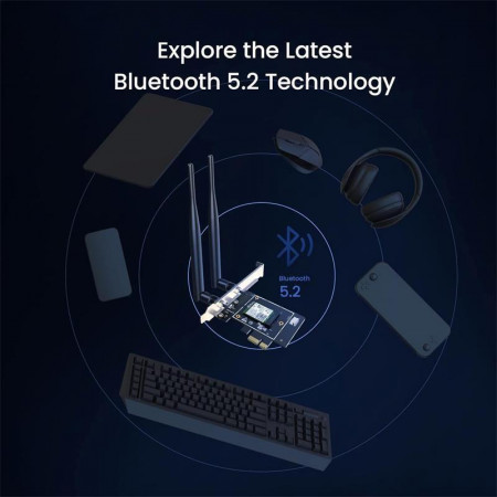 Además, cuenta con Bluetooth 5.2, proporcionando un mayor alcance y eficiencia energética para dispositivos conectados como teclados y ratones inalámbricos. Las antenas externas desmontables mejoran la recepción de la señal y la cobertura, asegurando una conexión confiable en todo momento.