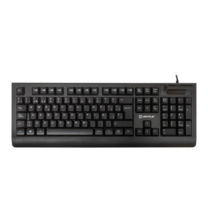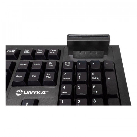 El teclado Unykach KB918 te ofrece la combinación perfecta de funcionalidad y seguridad. Este teclado de 105 teclas incorpora un lector de tarjetas inteligentes compatible con el DNI electrónico (DNIe) y tarjetas sanitarias, permitiéndote realizar trámites online con la administración pública, bancos y otras entidades de forma segura y cómoda.