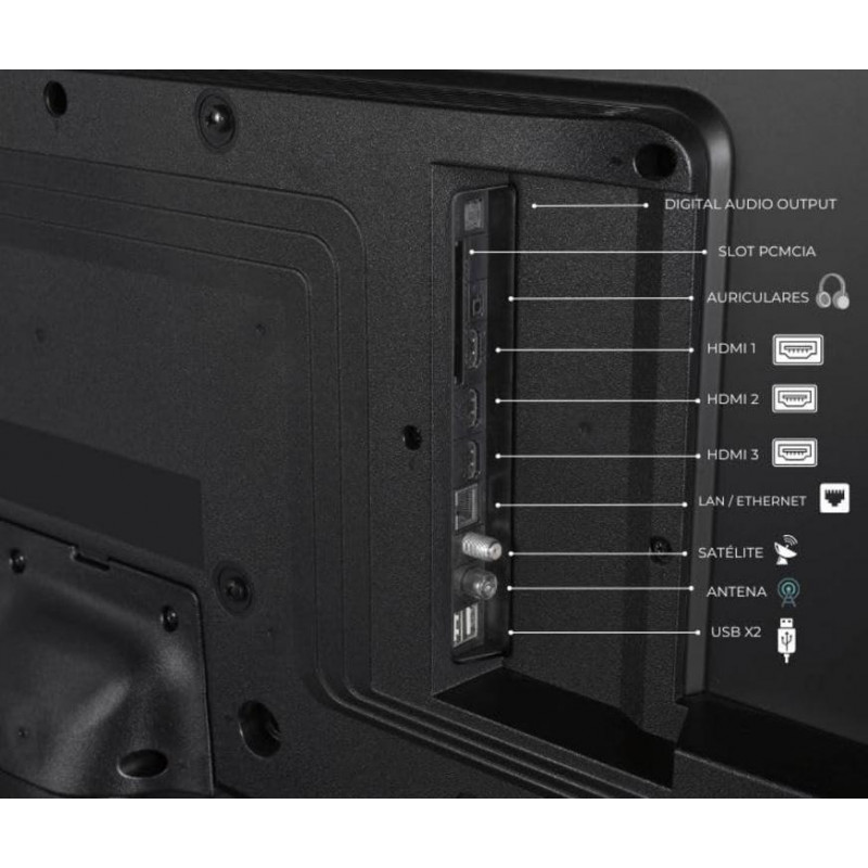 Además, cuenta con sintonizadores TDT2, cable y satélite (DVB-T2/C/S2 HEVC), funciones adicionales como grabación por USB, HbbTV y modo Hotel.