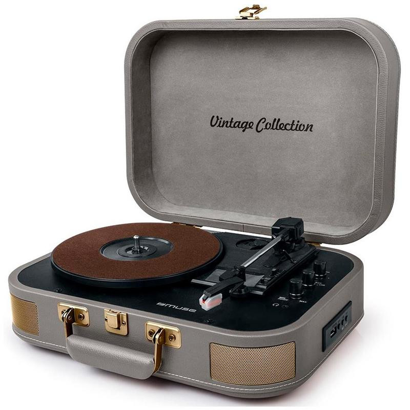 EAN 3700460207861El tocadiscos estéreo Muse MT-201BTG te permite disfrutar de tus vinilos favoritos con un toque moderno. Con su diseño elegante en gris claro y conectividad Bluetooth, este tocadiscos se integra perfectamente en cualquier espacio.