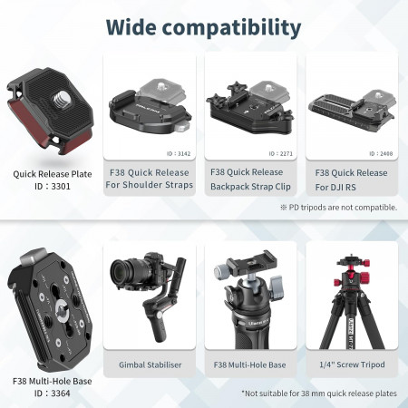- Amplia compatibilidad: 1/4 de agujero de tornillo en la base es compatible con trípodes, estabilizadores, cabezales, monitores de vídeo, monopies; 1/4 de rosca en la placa superior se adapta a cualquier cámara como Sony ZV-1, SLR, monturas de teléfonos móviles, adaptadores Gopro, etc.. También es compatible con la especificación Arca (Nota: La base de liberación rápida multiagujero F38 no es compatible con placas que no sean de la especificación F38).