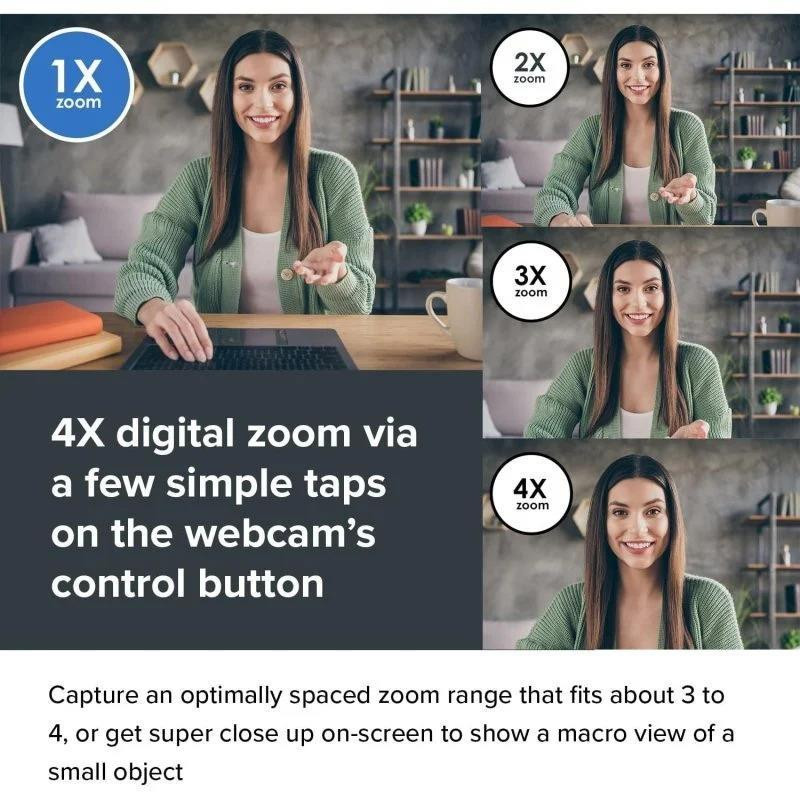 Equipada con zoom digital 4X, puede seleccionar entre una variedad de rangos de zoom que se adaptan mejor a sus necesidades y entorno. Ya sea que necesite incluir a varias personas en una presentación grupal o mostrar un objeto pequeño en detalle, esta webcam ofrece la flexibilidad que necesita.
